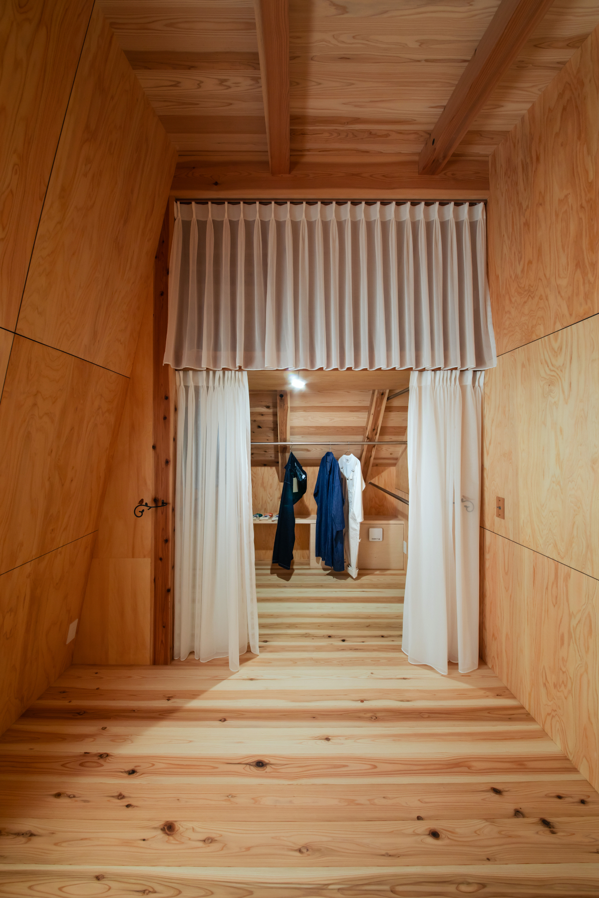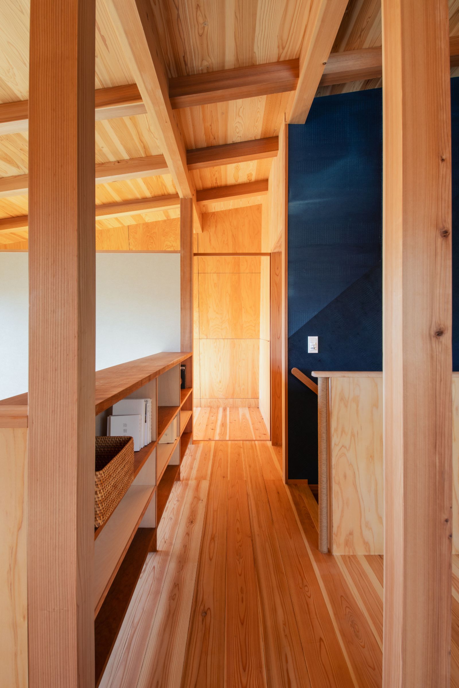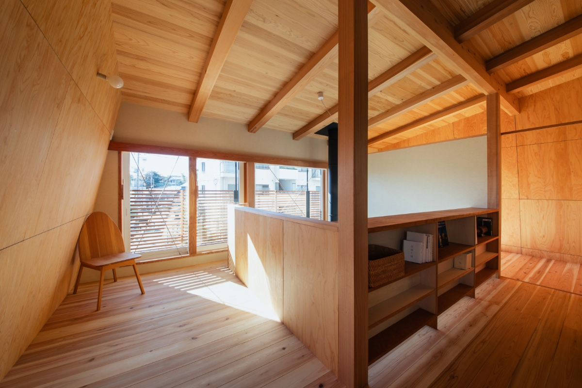 二階は山小屋のような落ち着きをもたらす静岡県産ヒノキベニヤの壁と