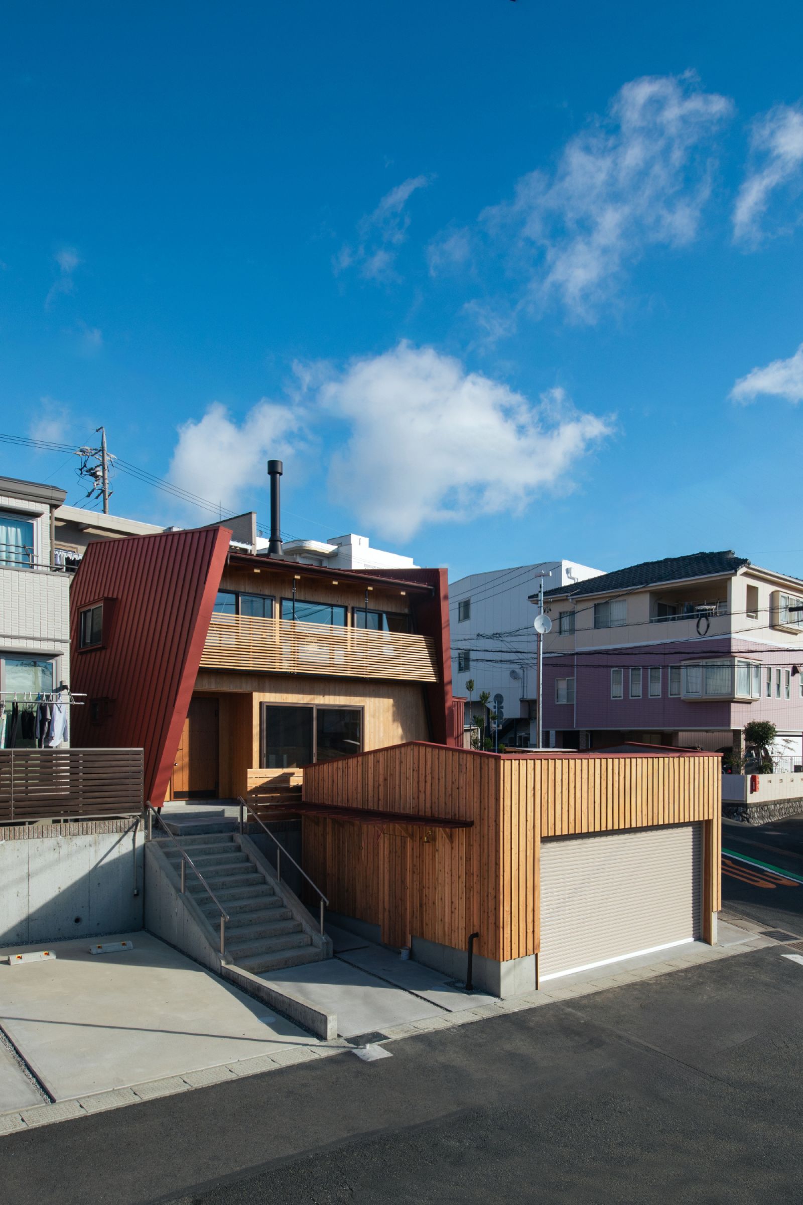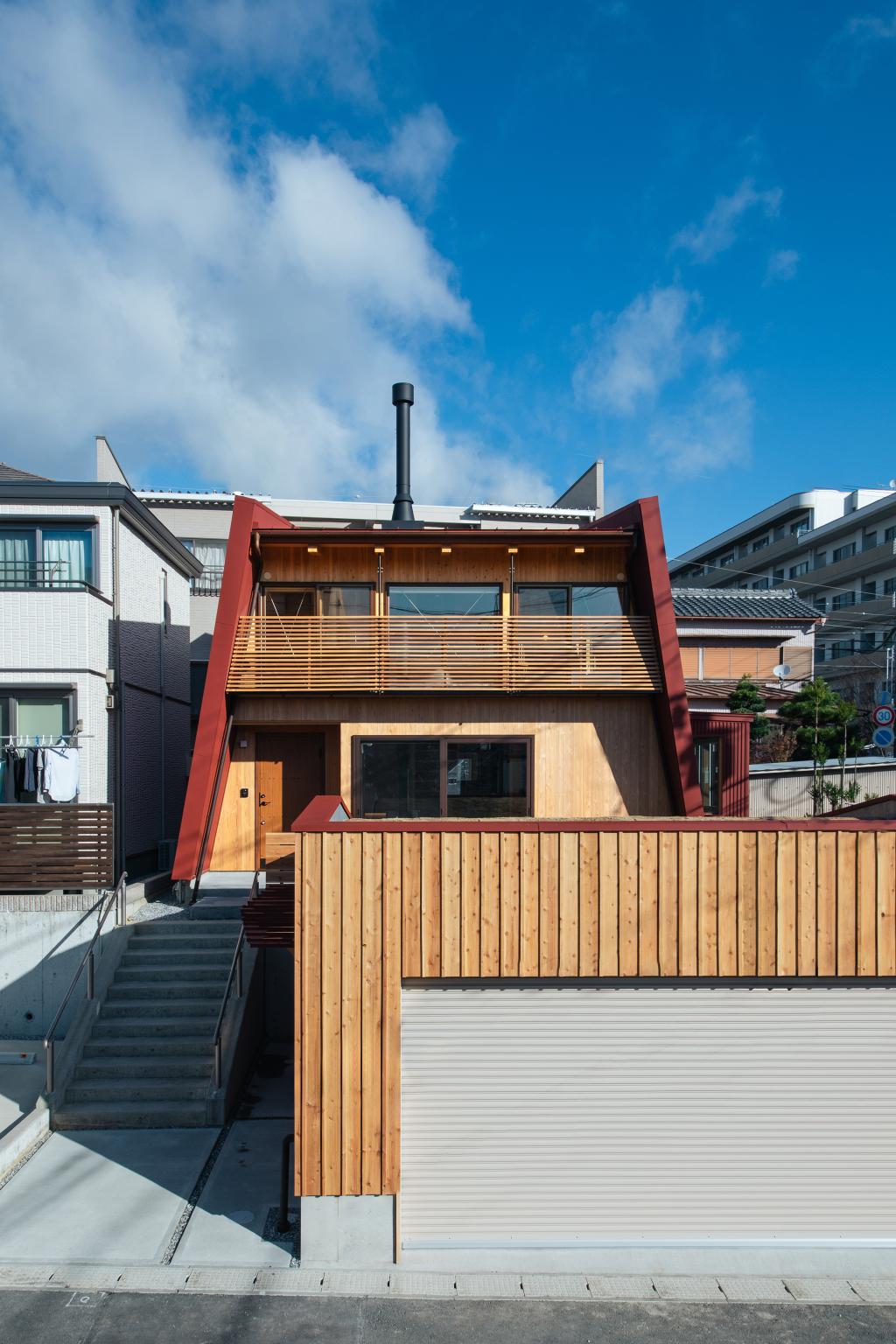 赤い板金壁が傾き、住まいをサンドイッチしたような